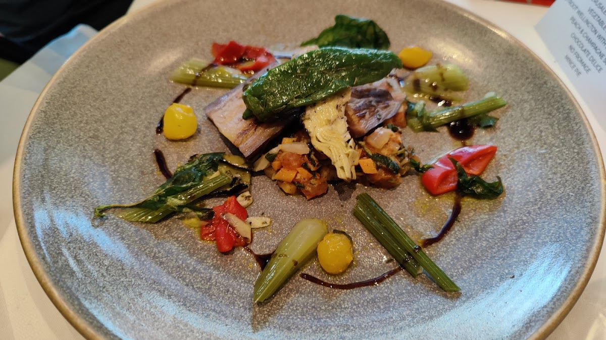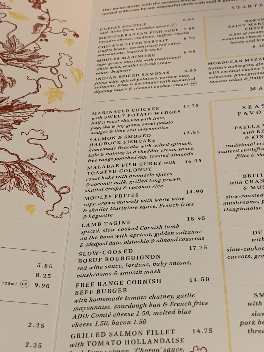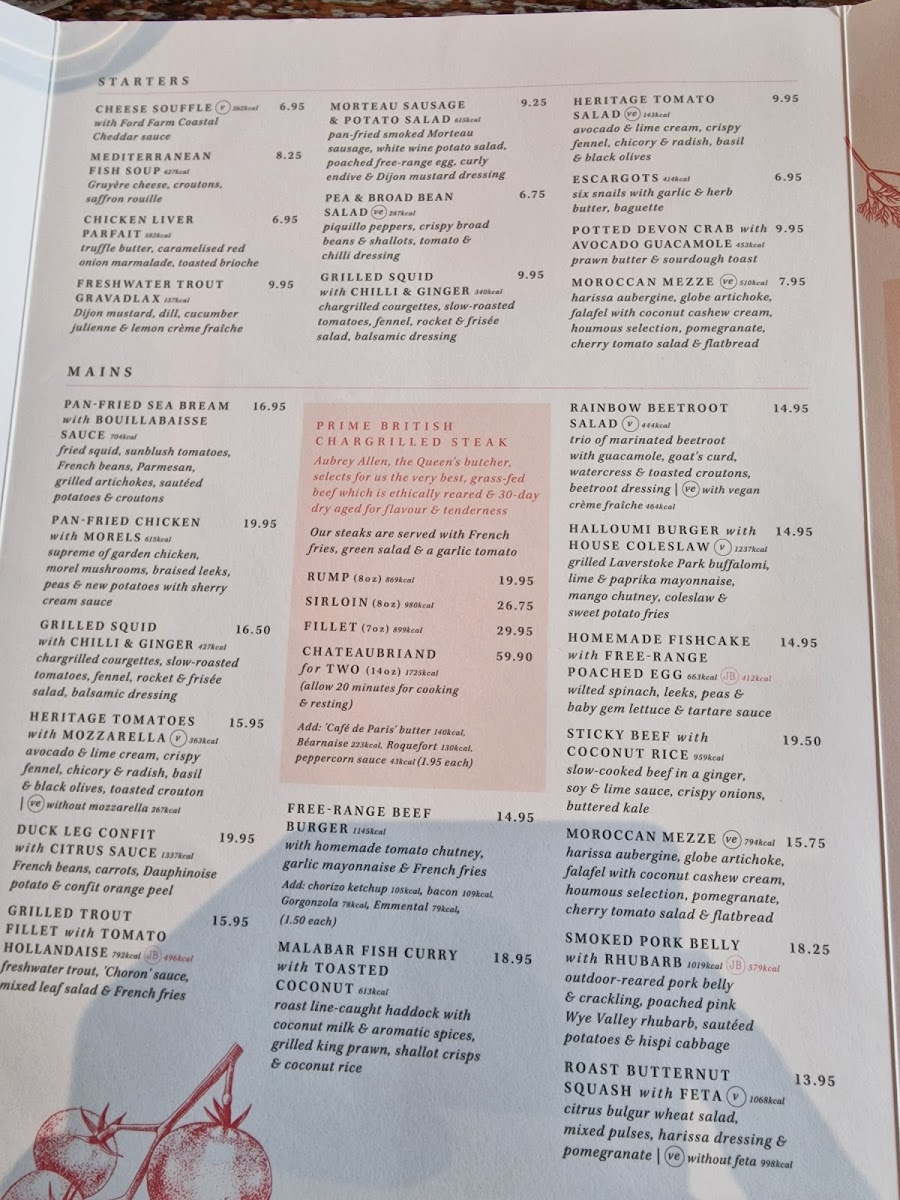 Highlights include the Prime Cornish Chargrilled Steaks like the exquisite Chateaubriand and the Le Grand' Steak Frites. For those preferring plant-based options, the Very Veggie selection features unique dishes like Grilled Cauliflower Steak with Truffle Cream and a delicious Moroccan Mezze Platter.